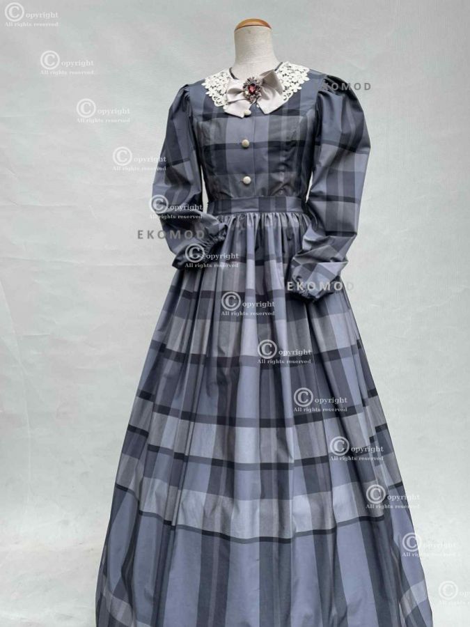 Długa suknia uszyta z tkaniny w kratę.