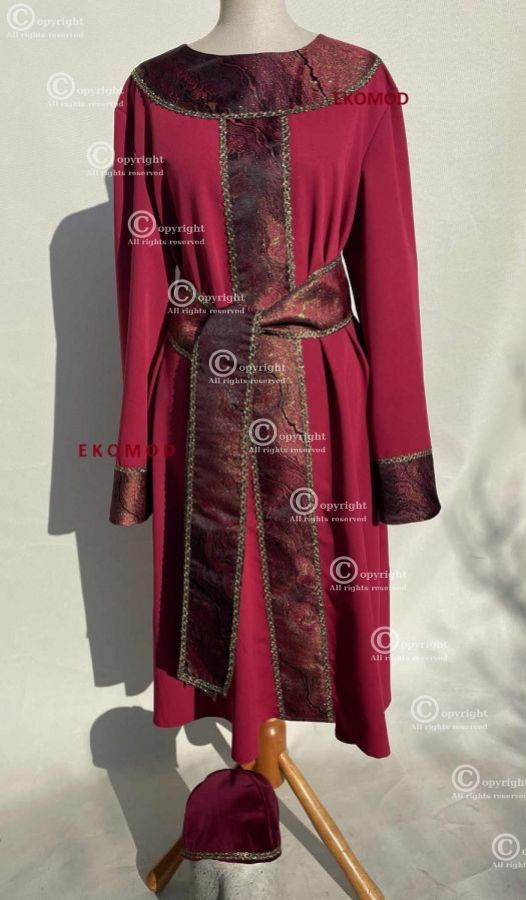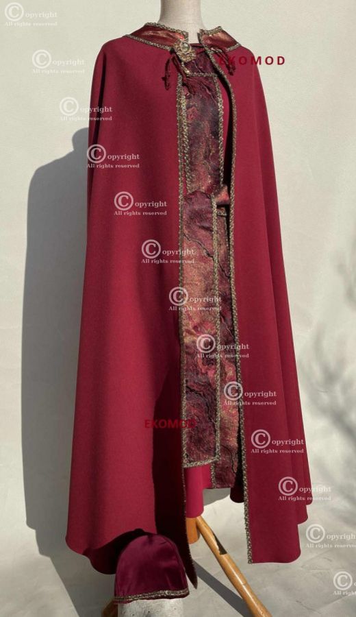 W skład stroju wchodzi: długa tunika do połowy łydki uszyta w formie trapezu, ozdobny pas do przewiązania, dluga peleryna zapinana na broszke pod szyją, nakrycie głowy (ale nie jest to korona).