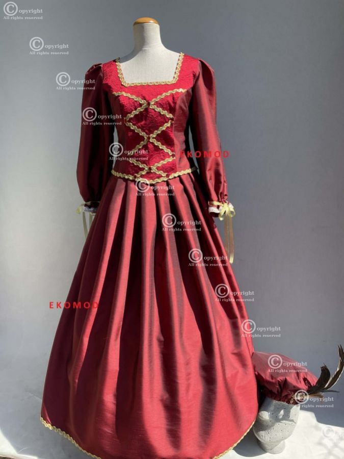 Suknia damska z materiału typu tafta z długim rękawem uszta w formie sukni renesansowej, z czasów Królowej Bony.